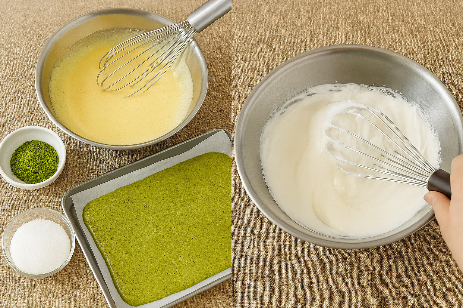 - Proper preparation of ingredients determines the final result. Bring eggs to room temperature, and sift matcha together with flour to evenly blend color and aroma into the batter.