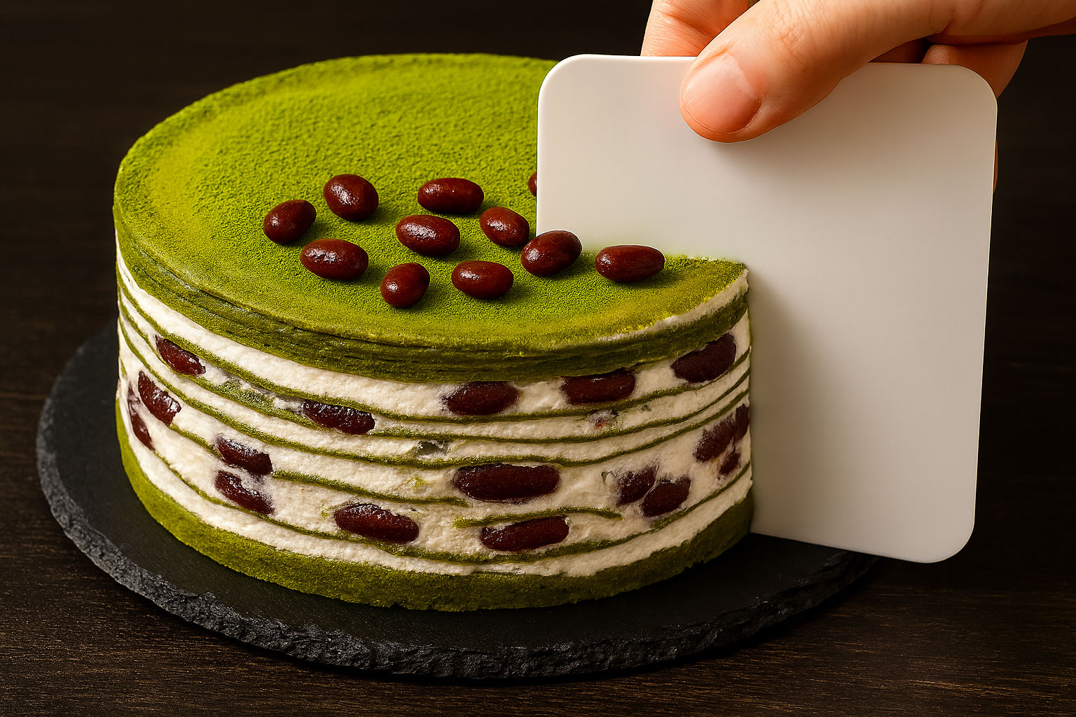 Each thin matcha crêpe is carefully stacked with a light cream that enhances the natural flavor of the azuki, creating delicate layers reminiscent of woven silk. With every bite, the slight bitterness of matcha harmonizes with the smooth sweetness of the beans, offering a moist texture and an elegant finish. It is a luxurious treat that beautifully blends traditional Japanese ingredients with the softness of a classic mille crêpe.